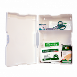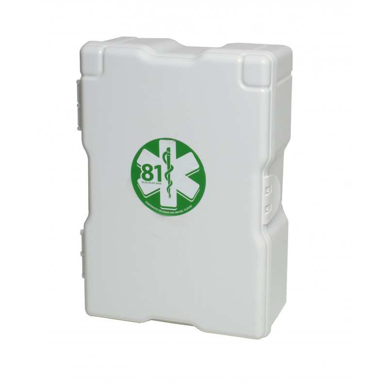 Armadietto in plastica RC colore bianco, 2 vani, 1 ripiano amovibile ,chiusura a scatto. Contenuto a norma del DM 388 del 15/07/2003 allegato 2 e D.L. 81 del 09/04/08 art.45. Per aziende o unit produttive con meno di tre lavoratori che non rientrano nel gruppo A. L'art.2 punto 5 del DM 388 del 15.7.2003 prevede che il contenuto di cui all'allegato 2 deve essere fornito ai lavoratori che operano in luoghi diversi dalla sede aziendale o unit produttiva.