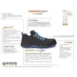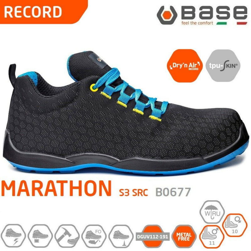 Modernità assoluta, tecnologia estrema per una calzatura dalle caratteristiche uniche; le Scarpe antinfortunistiche Base Marathon B0677 S3 SRC si presentano sul panorama della sicurezza come uno dei modelli più performanti della collezione Record.