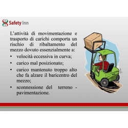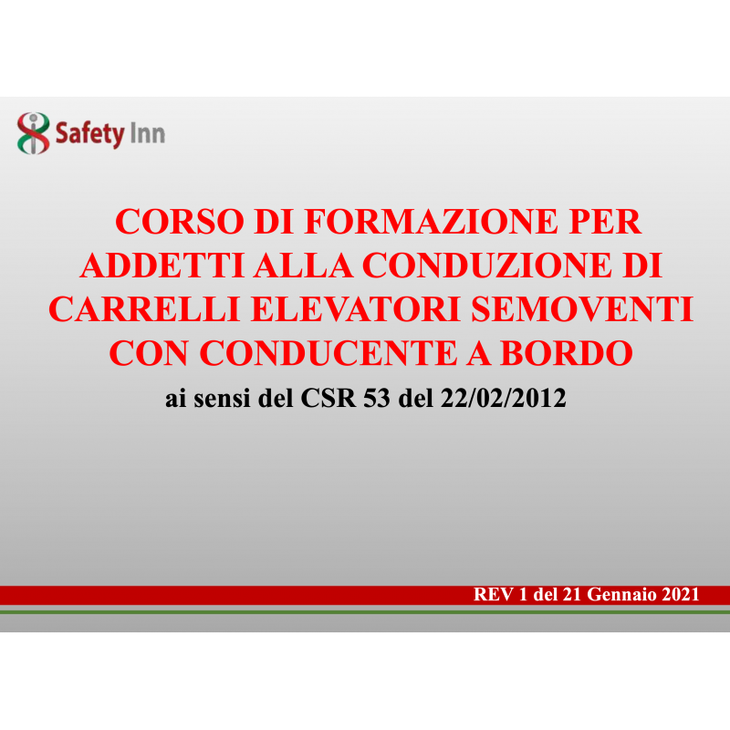 Le slides sono un supporto per i formatori che gestiscono corsi per addetti alla conduzione dei carrelli elevatori semoventi con conducente a bordo, carrelli semoventi con conducente a borso a braccio telescopico e rispettivi aggiornamenti, ed affrontano tematiche legate al corretto utilizzo in sicurezza degli stessi, secondo le disposizioni dell’Accordo Stato Regioni del 22 febbraio 2012 e Art. 73, comma 5 D.Lgs. 81/2008;